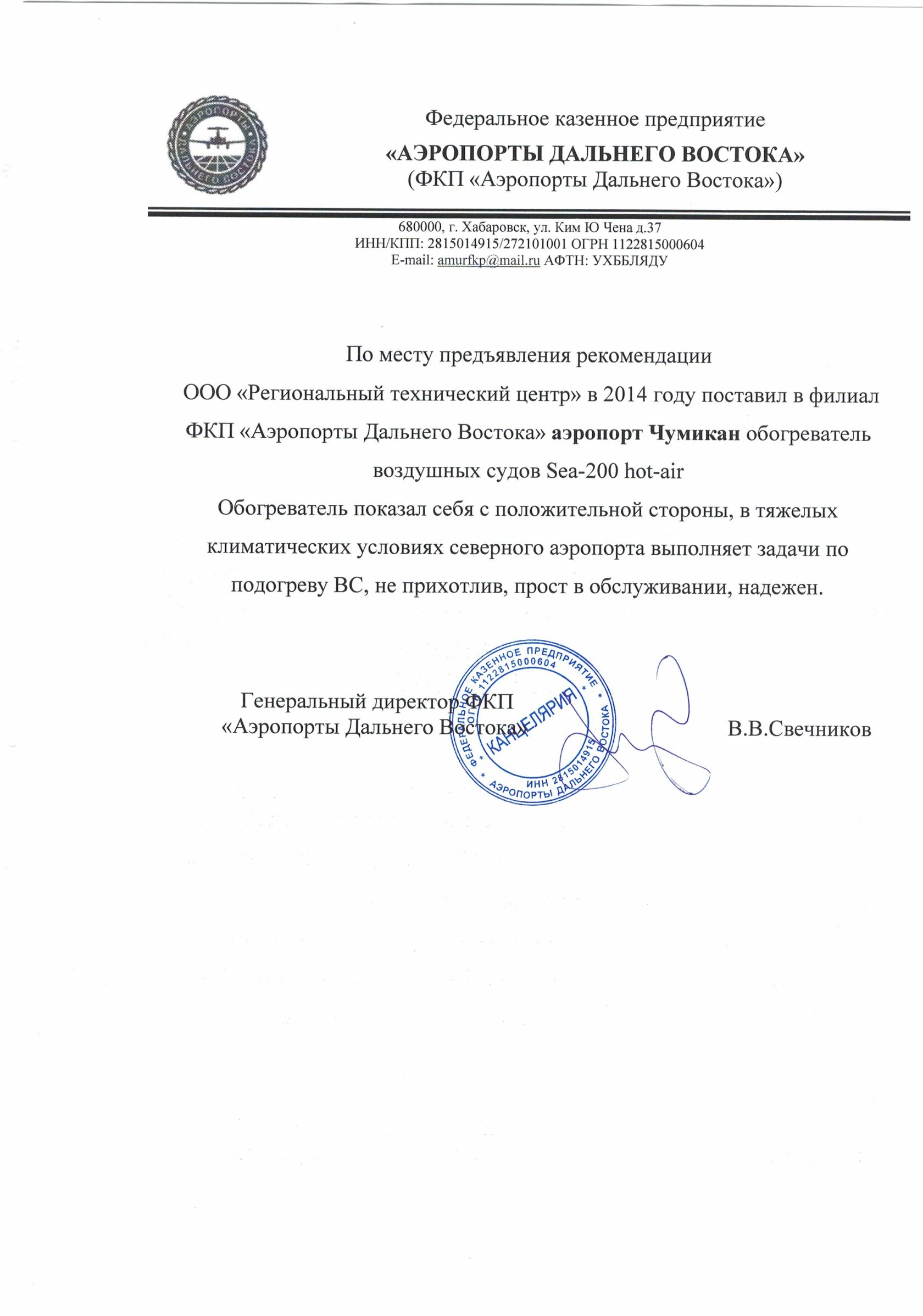 ООО «Региональный технический центр» в 2014 году поставил в филиал ФКП «Аэропорты Дальнего Востока» аэропорт Чумикан обогреватель воздушных судов Sea-200 hot-air. Обогреватель показал себя с положительной стороны, в тяжелых климатических условиях северного аэропорта выполняет задачи по подогреву ВС, не прихотлив, прост в обслуживании, надежен.