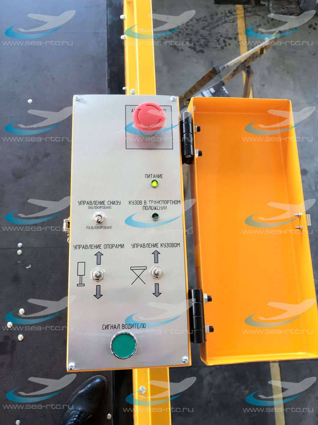 - Пульт управления в кабине водителя служит для включения системы, для включения проблескового маяка, для включения фары освещения рабочего места. На пульте в кабине водителя имеется световая сигнализация о том, что платформа не находится в транспортном положении.