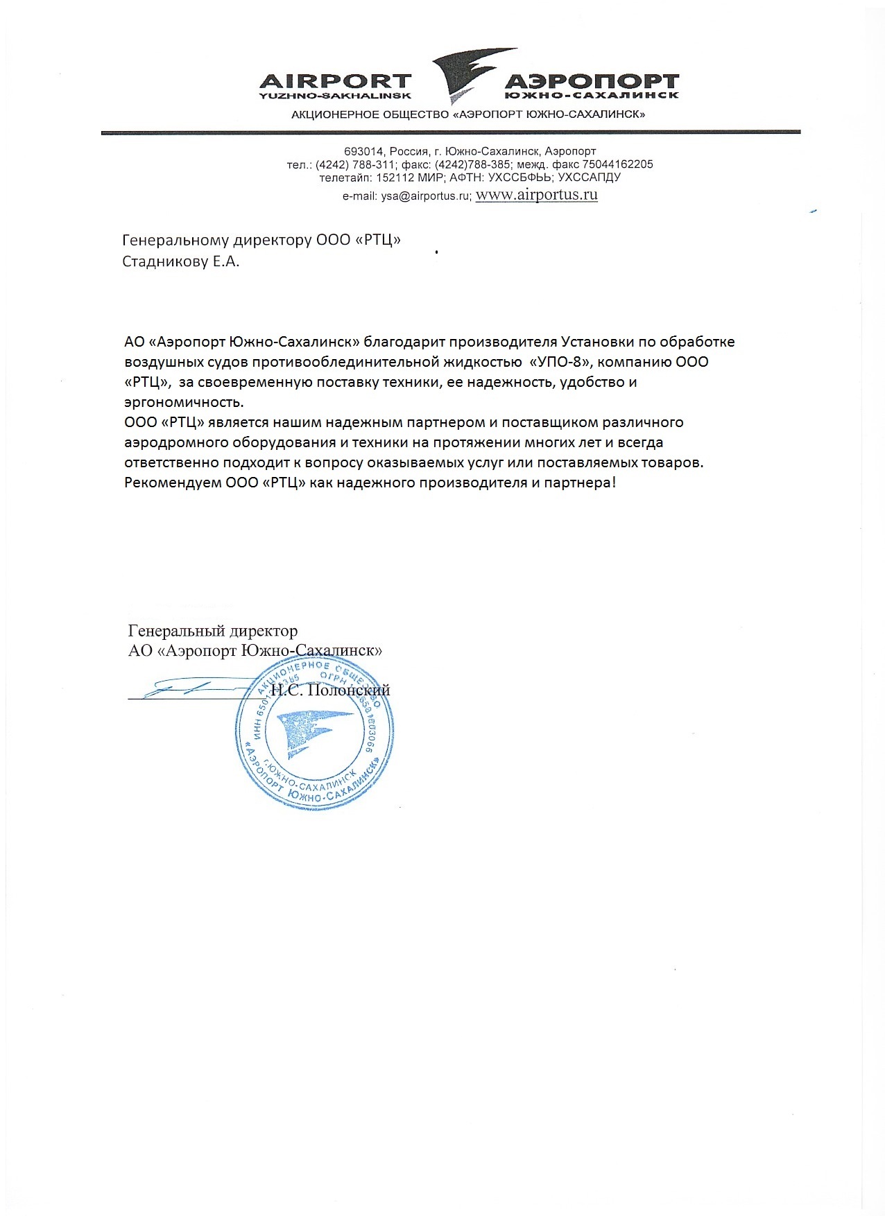 АО «Аэропорт Южно-Сахалинск» благодарит производителя Установки по обработке воздушных судов противооблединительной жидкостью «УПО-8», компанию ООО «РТЦ», за своевременную поставку техники, ее надежность, удобство и эргономичность. ООО «РТЦ» является нашим надежным партнером и поставщиком различного аэродромного оборудования и техники на протяжении многих лет и всегда ответственно подходит к вопросу оказываемых услуг или поставляемых товаров. Рекомендуем ООО «РТЦ» как надежного производителя и партнера!