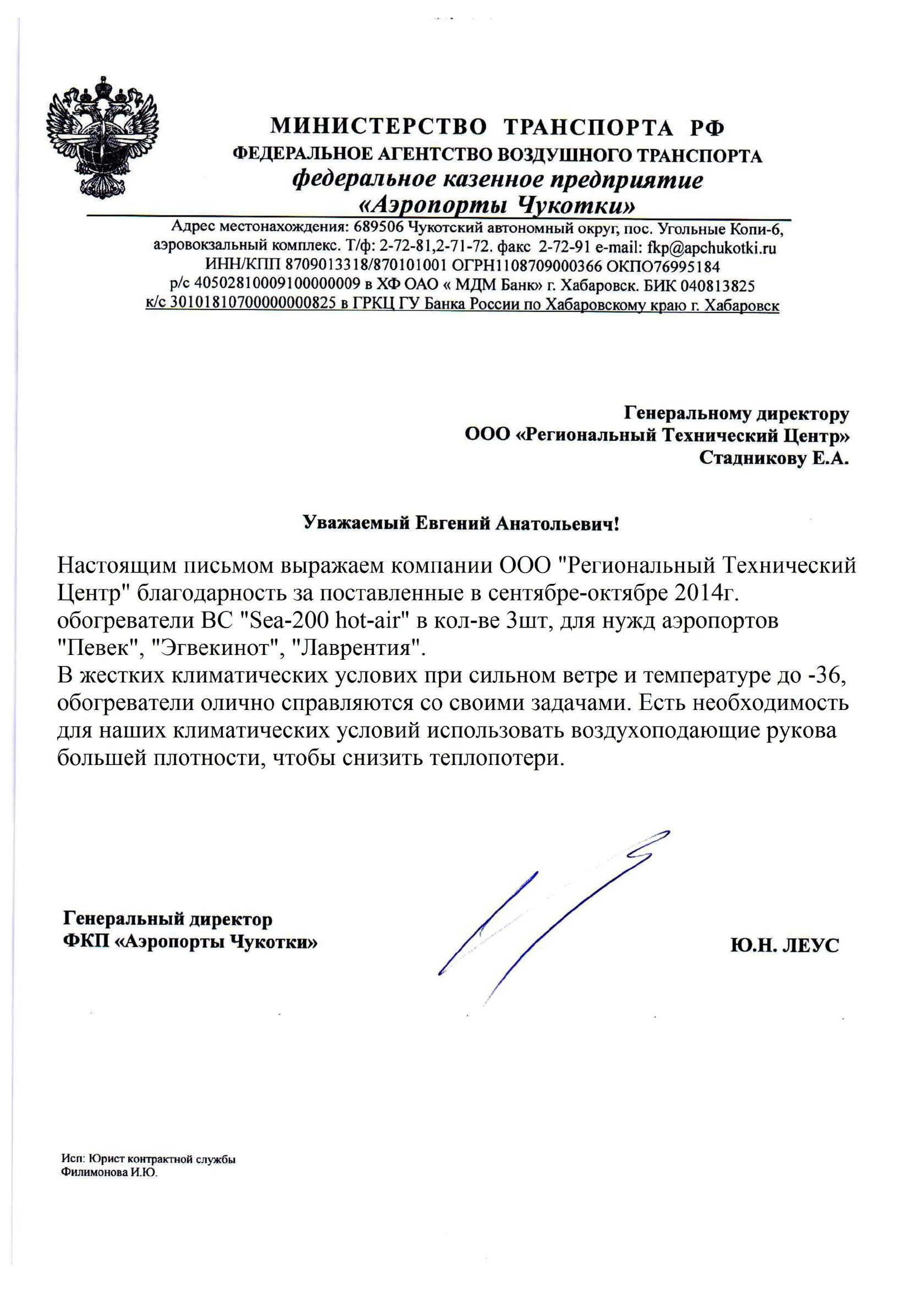 Настоящим письмом выражаем компании ООО "Региональный Технический Центр" благодарность за поставленные в сентябре-октябре 2014г. обогреватели ВС "Sea-200 hot-air" в кол-ве 3шт, для нужд аэропортов "Певек", "Эгвекинот", "Лаврентия". В жестких климатических услових при сильном ветре и температуре до -36, обогреватели олично справляются со своими задачами. Есть необходимость для наших климатических условий использовать воздухоподающие рукова большей плотности, чтобы снизить теплопотери.