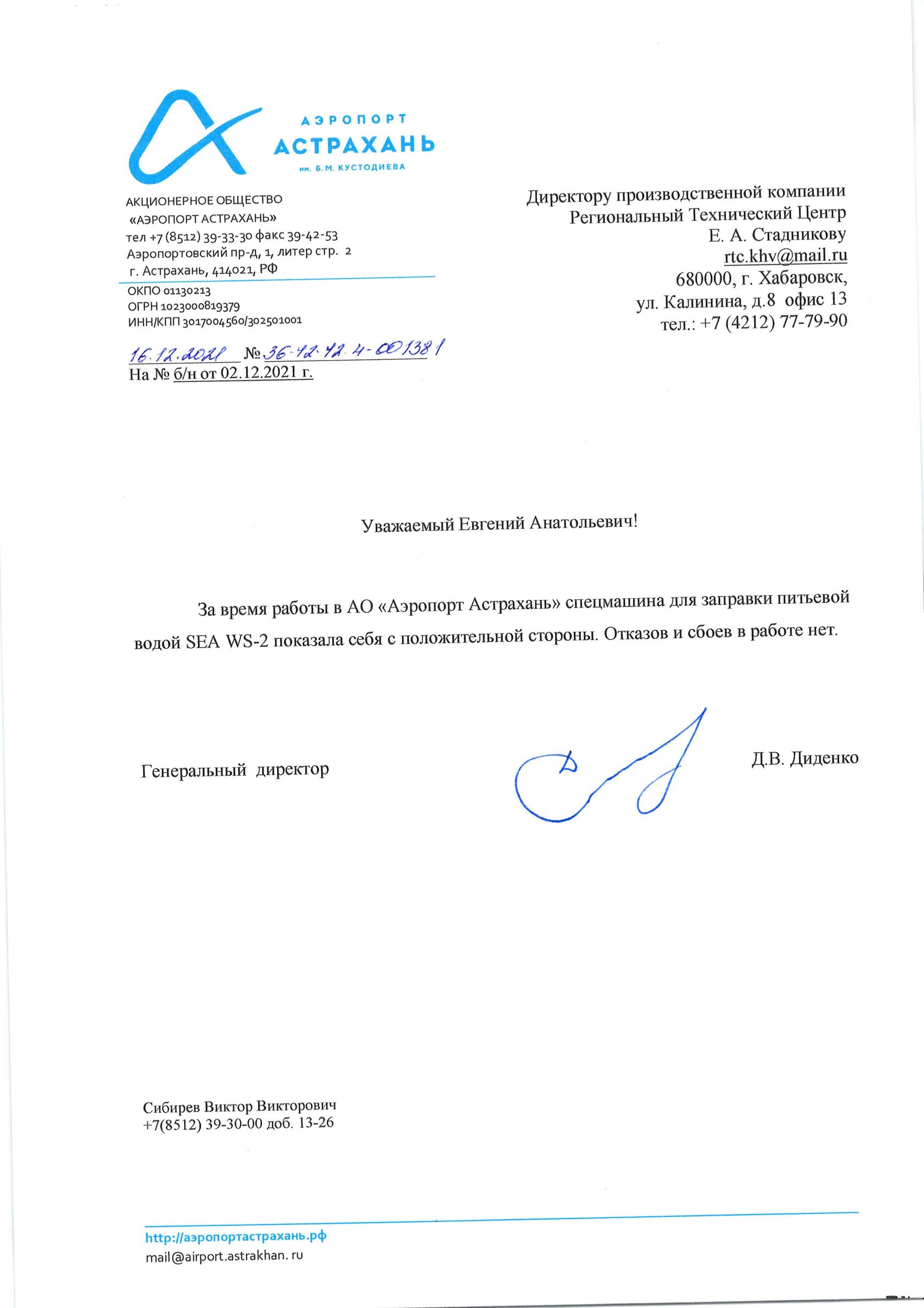 За время работы в АО «Аэропорт Астрахань» спецмашина для заправки питьевой водой SEA WS-2 показала себя с положительной стороны. Отказов и сбоев в работе нет.