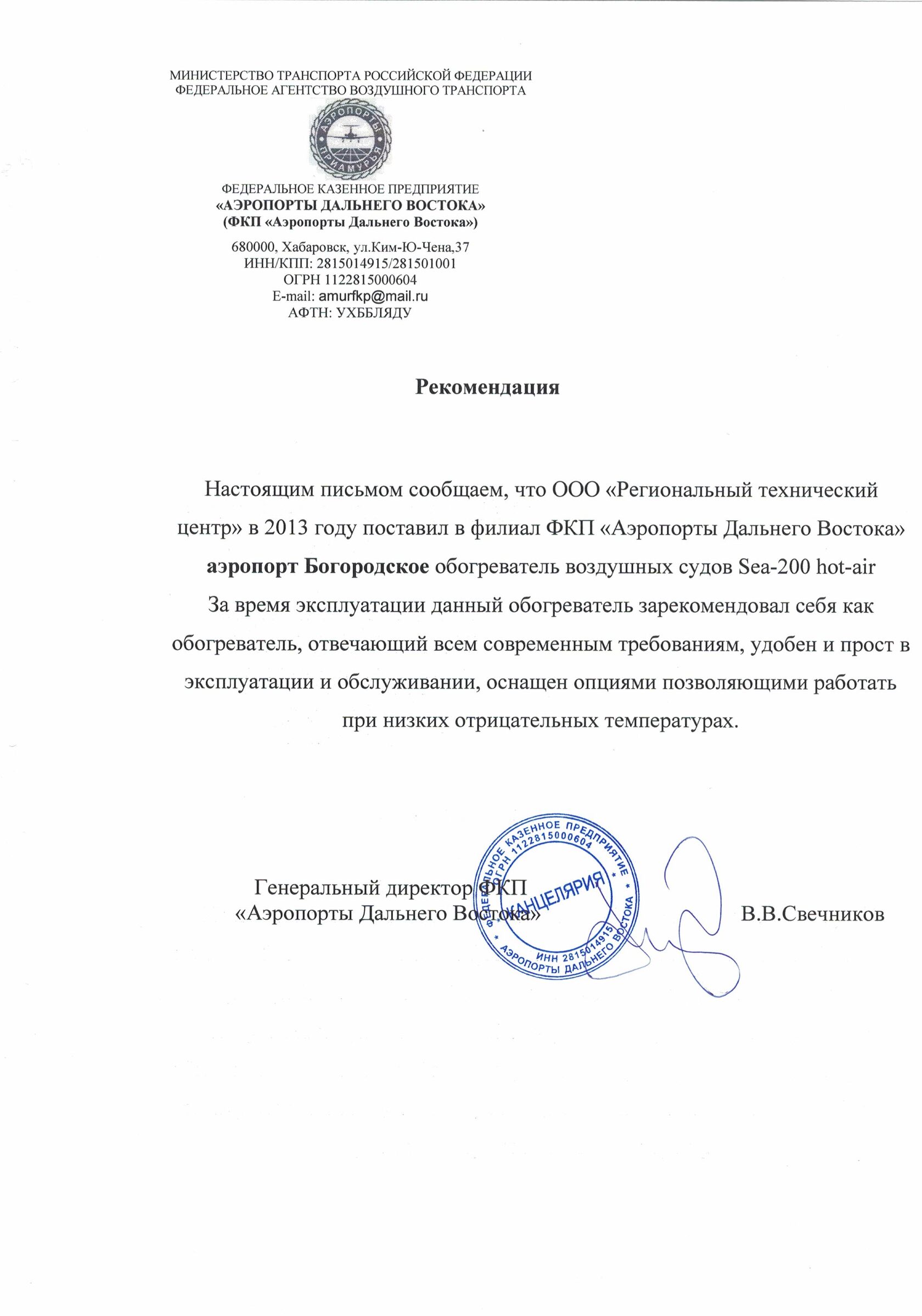 Настоящим письмом сообщаем, что ООО «Региональный технический центр» в 2013 году поставил в филиал ФКП «Аэропорты Дальнего Востока» аэропорт Богородское обогреватель воздушных судов Sea-200 hot-air За время эксплуатации данный обогреватель зарекомендовал себя как обогреватель, отвечающий всем современным требованиям, удобен и прост в эксплуатации и обслуживании, оснащен опциями позволяющими работать при низких отрицательных температурах.